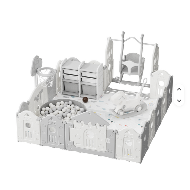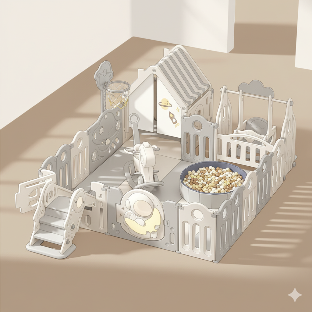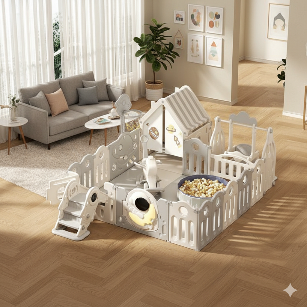 Evde güvenli oyun alanı yaratmak isteyen aileler için tasarlanan bu çok fonksiyonlu oyun parkı; çocukların enerjilerini keyifli ve güvenli şekilde atmasını sağlar. Oyun evi, kaydırak, salıncak, basket potası, tahterevalli ve top havuzu gibi birçok farklı aktiviteyi tek alanda birleştirir. Yumuşak renk tonları, yuvarlatılmış kenarlar ve sağlam malzeme yapısı sayesinde hem şık bir görünüm sunar hem de maksimum güvenlik sağlar. Çocuğunuzun hem motor becerilerini hem de sosyal gelişimini destekleyen bu set, evinizin salonunu eğlenceli bir oyun alanına dönüştürür.